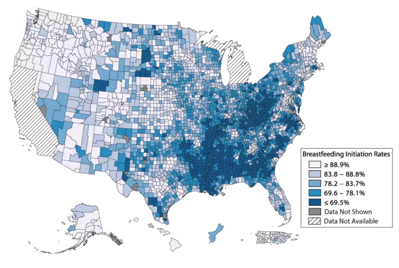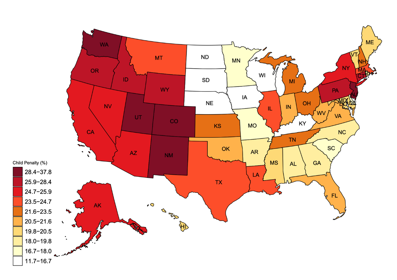 Indeed, there appears to be a strong correlation between breastfeeding rates and new mothers’ reductions in employment in the United States (see figure). For example, the Pacific Northwest has both high breastfeeding rates (at top) and high child penalties in employment (at bottom). This is striking because states like Oregon, Washington, and Colorado are much more politically liberal than Utah or Idaho, yet both sets of places see similarly large reductions in women’s employment after having a child. These are, however, just associations. To date, there is very little evidence on the causal effect of breastfeeding on mothers’ careers. My research seeks to fill that gap.
